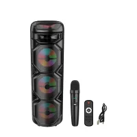 اسپیکر جدید سه ساب(سه باند) ZQS 8301 محصول جدید از شرکت ZQS که در ایران علاقمندان زیادی دارد این اسپیکر زیبا و باکیفیت دارای سه باند 8 اینچ است که همین امر باعث شده پرتاب صدای خوبی نسبت به اسپیکرهای 2 باند داشته باشد. طراحی شیک و زیبا با چرخ‌های روان باعث شده که شما بتوانید به راحتی آن را حمل کنید. یکی از مهمترین ویژگی‌های این محصول جدید که داری میکروفون وایرلس(بیسیم) قابل شارژ با پورت TPC است که جدیدا اسپیکرهای شرکت zqs این قابلیت را اضافه کرده است. ریموت کنترل، کابل شارژ TPC, باطری 4500 میلی‌آمپر ساعت، توان خروجی 60 وات، اتصال کارت حافظه، USB.AUX و بلوتوث. این ویژگیها باعث شده که این محصول صدای باکیفیت،قیمت مناسب،جمع و جور،بیس نرم، برای شرکت در مجالس شادی و دورهمی خانوادگی شما عزیزان باشد.